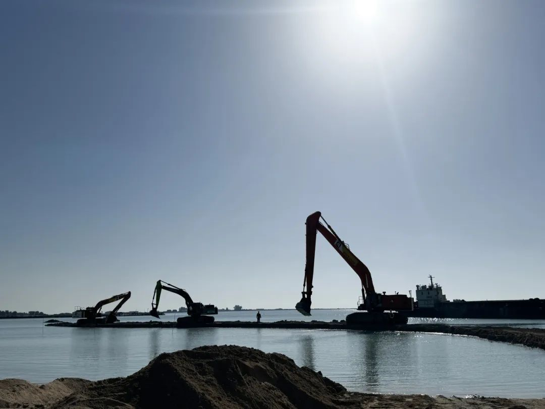 疏浚工程开工以来,面对潮汐变化严重、近水施工安全隐患大、近海侧地质坚硬等困难,项目团队以创新思维破解施工难题,通过陆海协同作业模式,采用“铺筑施工便道”方案,使用不同型号设备交叉作业,确保所有作业面全部精准达到设计要求,按期完成疏浚工程施工。
