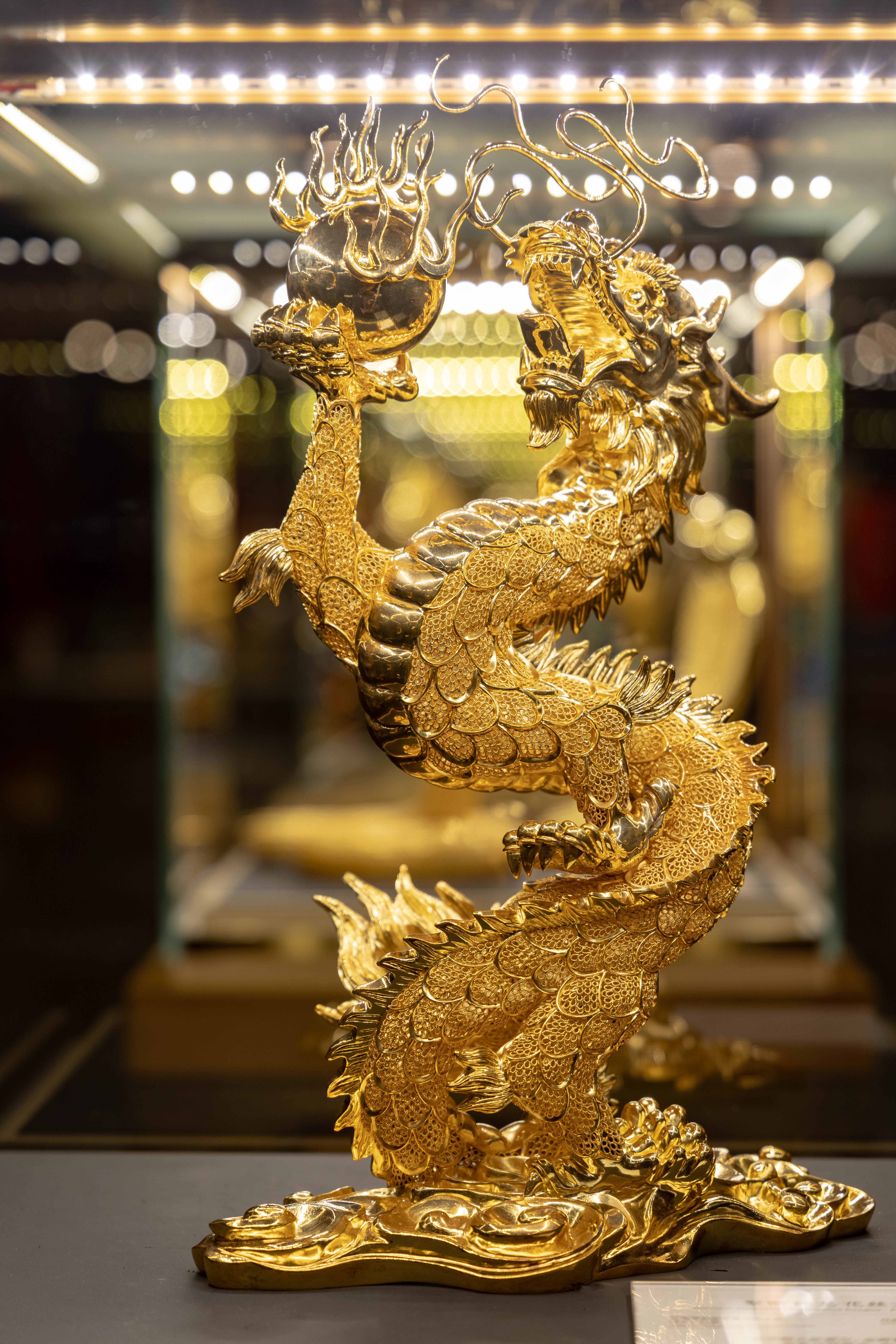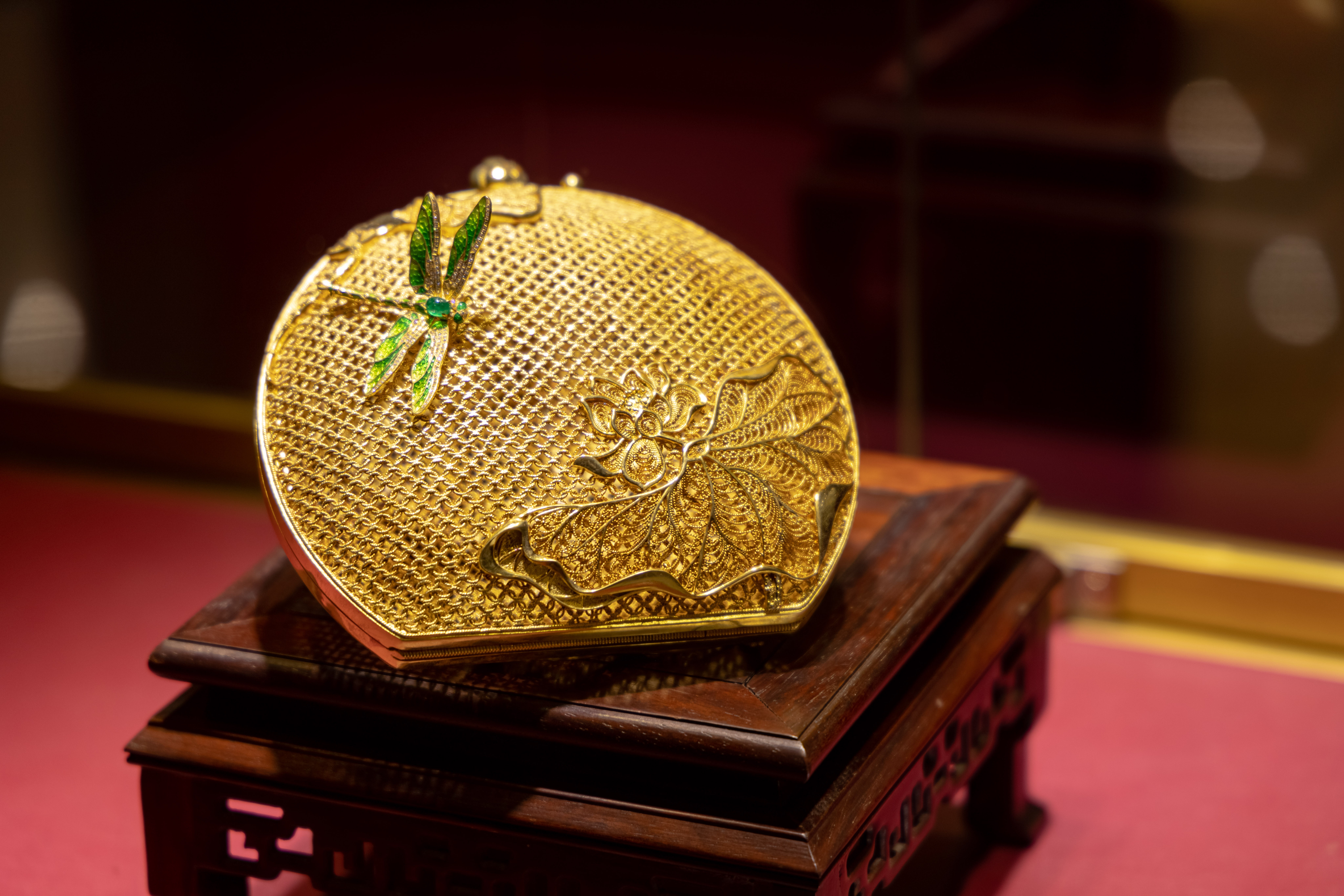 本次展览历时三年筹备,从全球藏品及故宫复制珠宝中精选130件“国宝级”艺术珍品,首次公开亮相。展馆核心区域陈列的为非遗花丝镶嵌系列。展馆内,观众可近距离欣赏国家级非物质文化遗产清朝宫廷花丝镶嵌技艺与錾刻工艺的巅峰之作。这些作品以金为纸、以艺为笔,每一处细节都凝聚着匠人数十年如一日的坚守。