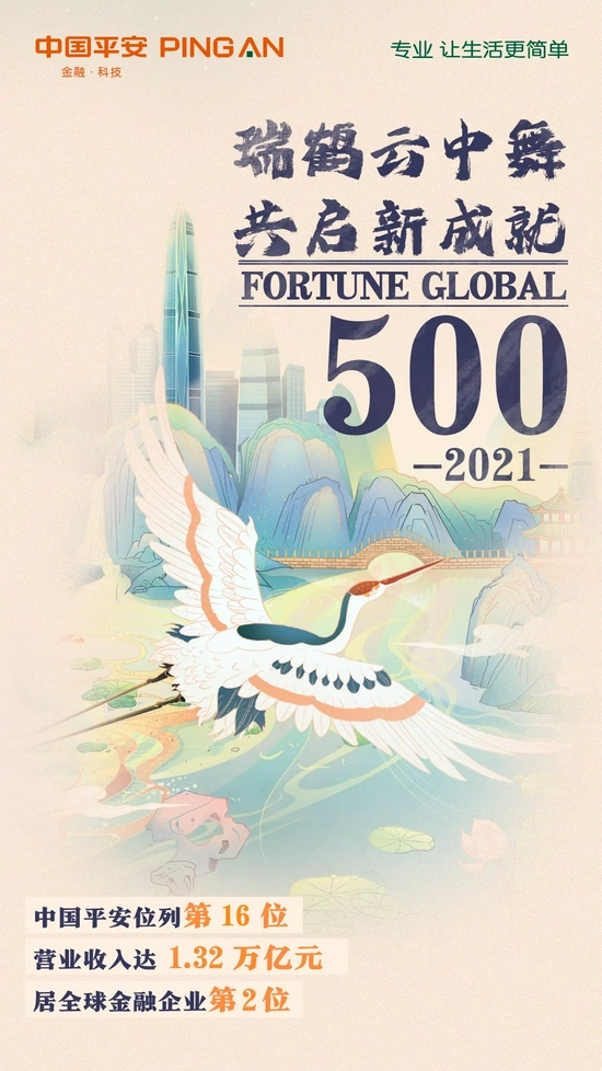 8月2日,2021年度《财富》世界500强排行榜揭晓,中国平安凭借持续稳健的业绩增长,以191,5亿美元的营业收入位列全球榜单第16位,较去年上升5位,全球金融企业排名第2位,在中国入围企业中排名第5位,蝉联中国内地混合所有制企业第1位。