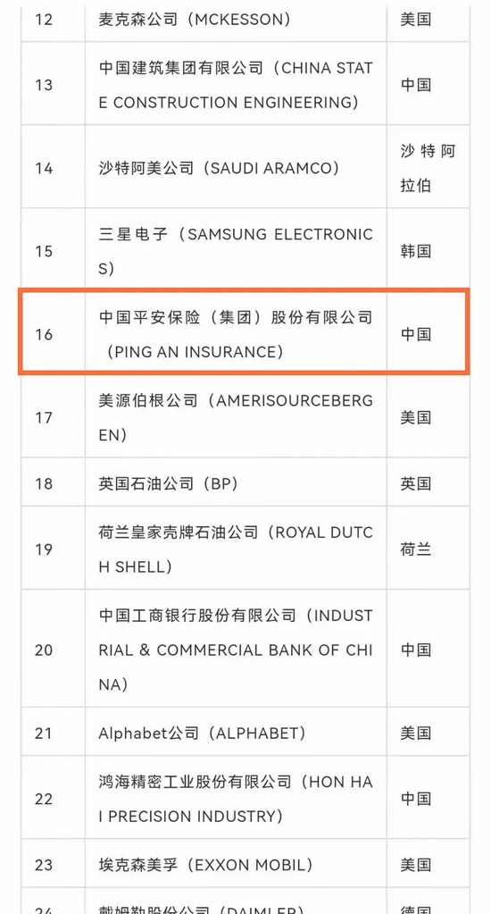 榜单显示,除中国平安外,榜单中前20强的中国企业还包括:国家电网(2位)、中石油(4位)、中石化(5位)、中国建筑(13位)、中国工商银行(20位)。