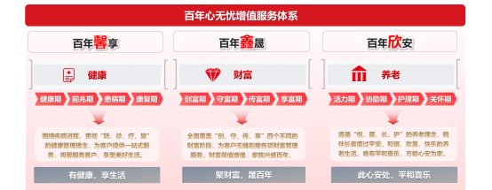 2024年,百年人寿启动以客户为中心服务升级,围绕健康、财富、养老三大核心需求,搭建全生命周期“心无忧”增值服务体系,并推出“百年馨享”(健康无忧)、“百年鑫晟”(财富无忧)、“百年欣安”(养老无忧)三大子品牌,用心为客户打造无忧生活。