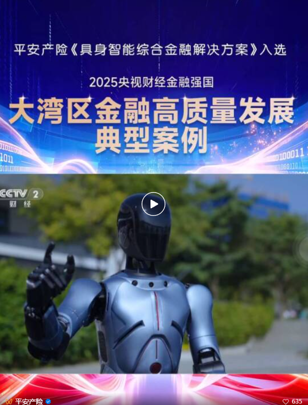 近日,中央广播电视总台“央视财经金融强国——大湾区金融之夜”在深圳成功举办。活动以“金融赋能湾区创新引领未来”为主题,生动展现大湾区“十四五”期间金融领域改革创新成果。在活动上,平安产险的具身智能综合金融解决方案入选了“大湾区金融高质量发展典型案例”,并通过短片展示了保险助力人形机器人研发创新的有益探索。