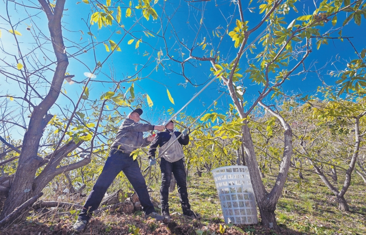 蚕农汪德会(左)和女婿在板栗园采摘蚕茧。记者 查金辉 摄