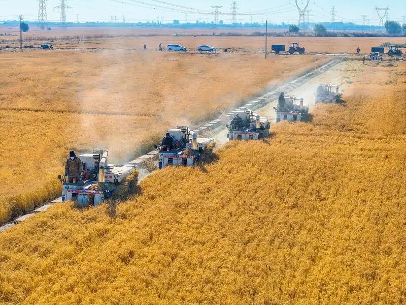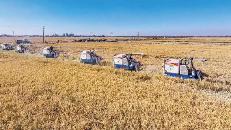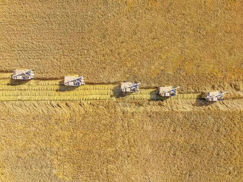 水稻收割机排列成行,开始大面积收割。