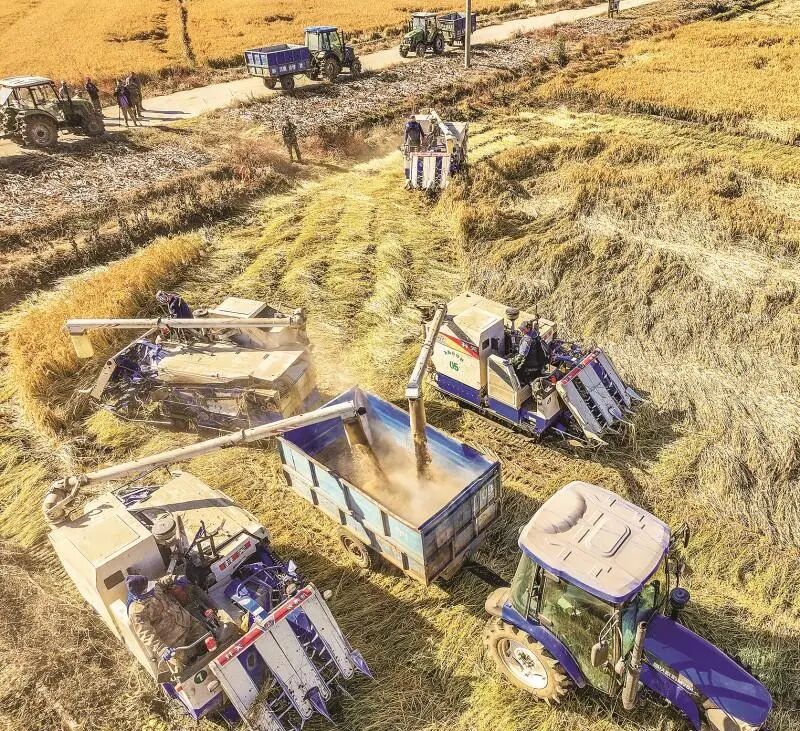 秋收现场展现出一幅美丽画卷。