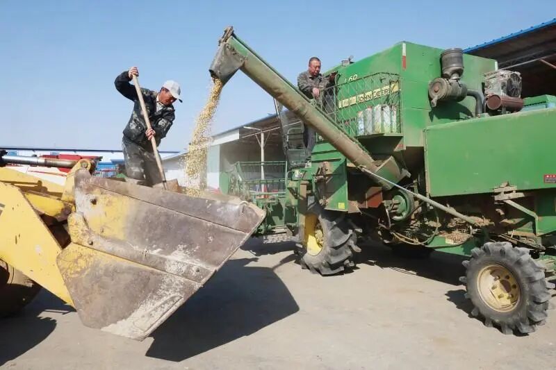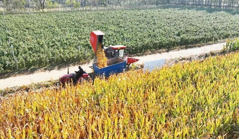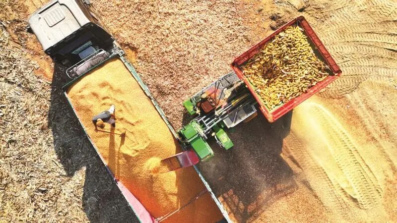 玉米联合收割机在沃野上收割作业。