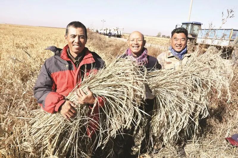 农民抱着坠弯了腰的稻穗,笑得合不拢嘴。