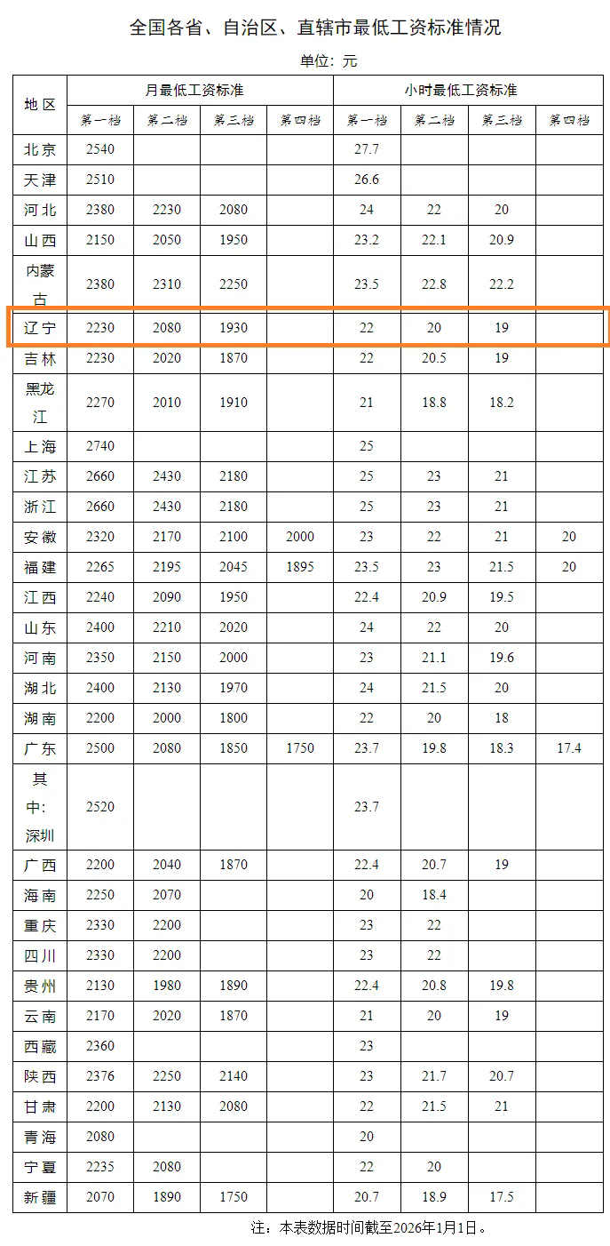 最低工资标准档位最多为四档