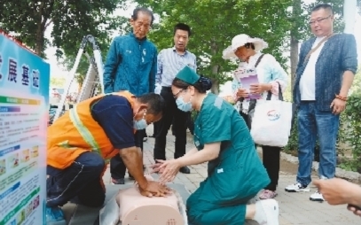 今年6月是第21个全国“安全生产月”,活动主题是“遵守安全生产法,当好第一责任人”。6月16日是全国安全宣传咨询日,当日,朝阳市多家单位的工作人员走上街头,集中进行安全生产知识宣传,把安全知识送到百姓身边。图为医护人员正在为市民讲授心肺复苏急救方法。特约记者 李松娟 摄