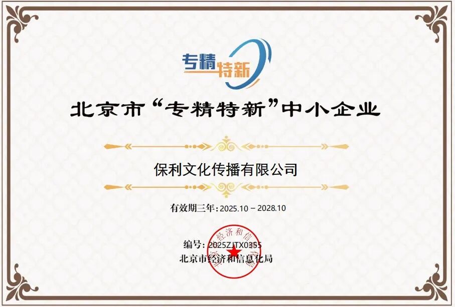 近日,北京市经济和信息化局公布了最新一批“北京市专精特新中小企业”名单。保利文化传播有限公司凭借其在数字展示、AI内容生产领域的专业实力与创新成果,成功获评“北京市专精特新中小企业”。这一认定不仅是对保利文化传播在数字文化产业细分领域长期深耕与持续创新的高度肯定,也标志着公司在推动文化新质生产力方面的领先优势与创新实力。