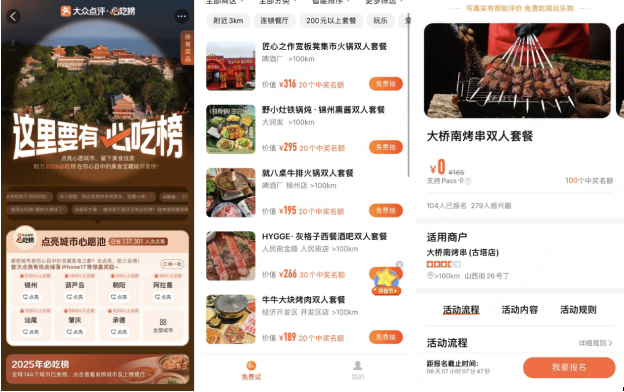 活动期间,全国食客只需进入大众点评App,选择城市至锦州,搜索“锦州请客吃饭”进入活动页面,就有机会抽中上述免费套餐,或者进入商户线上页面,以优惠价格购买团购套餐。