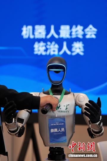 11月9日,首届中国(国际)机器人辩论大赛决赛在北京亦庄举行。图为湖北大学队机器人选手在冠亚军争夺赛中作为正方发表观点。中新社记者张祥毅摄