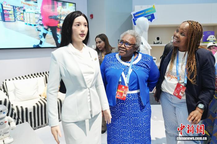 10月14日,参加全球妇女峰会的部分嘉宾参访北京机器人大世界。图为机器人4S店的家政服务机器人吸引嘉宾。中新社记者张祥毅摄