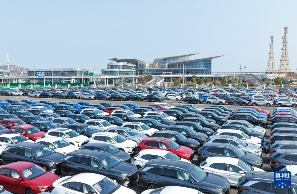 3月10日拍摄的江苏省连云港港出口汽车堆场(无人机照片)。新华社发(王健民摄)