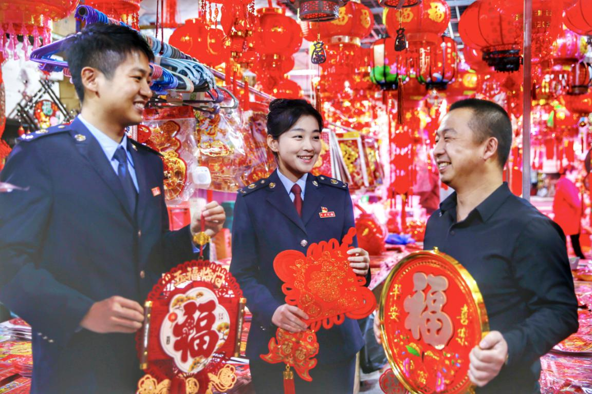 新春将至,年味正浓。国家税务总局北镇市税务局税务干部走进年货市场,结合商户经营规模与特点,开展税费政策辅导,提示纳税人按期申报纳税、合规经营。图为税务干部在北镇市老爷庙市场金辉儿童玩具店调研。(杨光 王晓旭 摄)
